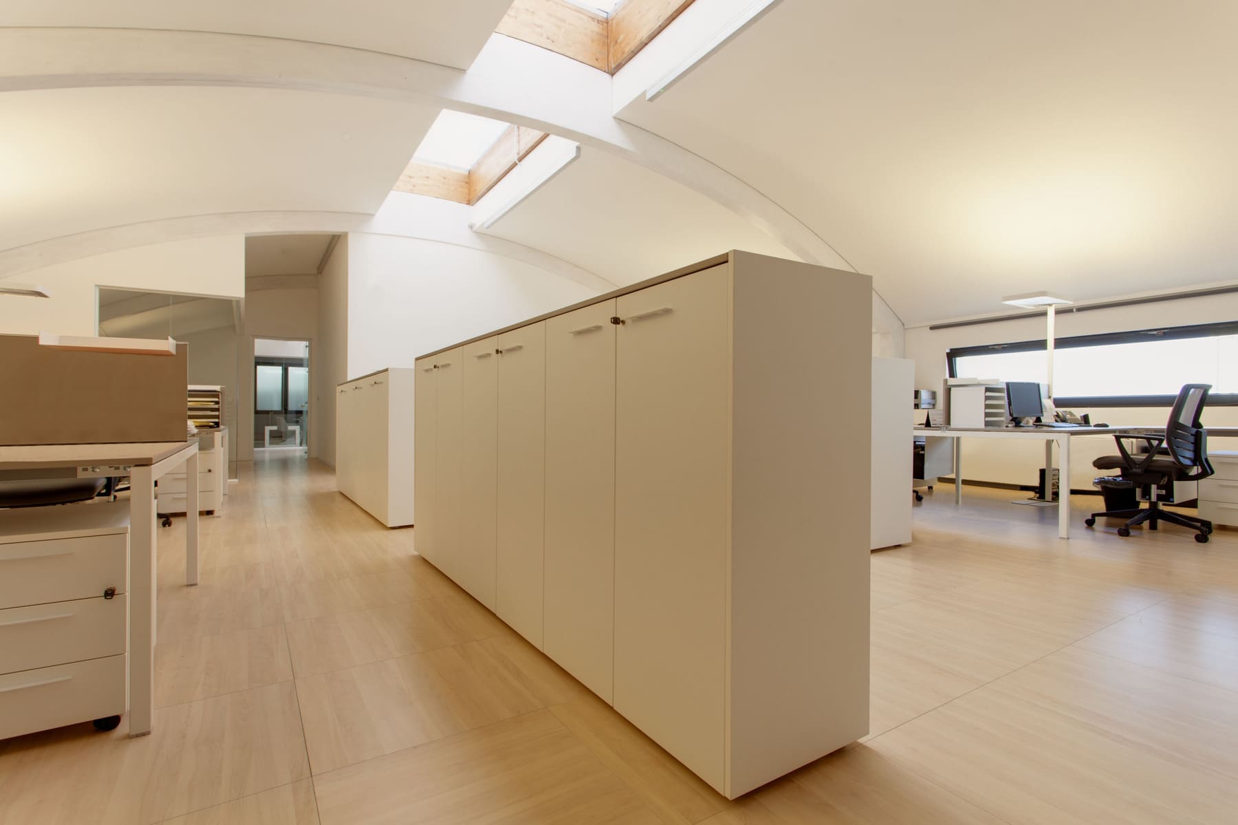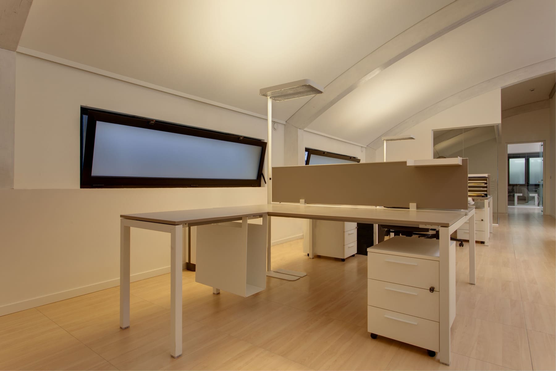 Les parois vitrées sur mesure ont été utilisées pour créer des espaces lumineux et communicatifs, garantissant transparence et continuité visuelle sans renoncer à l’intimité. Le choix du mobilier et des parois Frezza a ajouté une touche d’élégance contemporaine aux espaces, avec des solutions qui combinent esthétique et fonctionnalité.